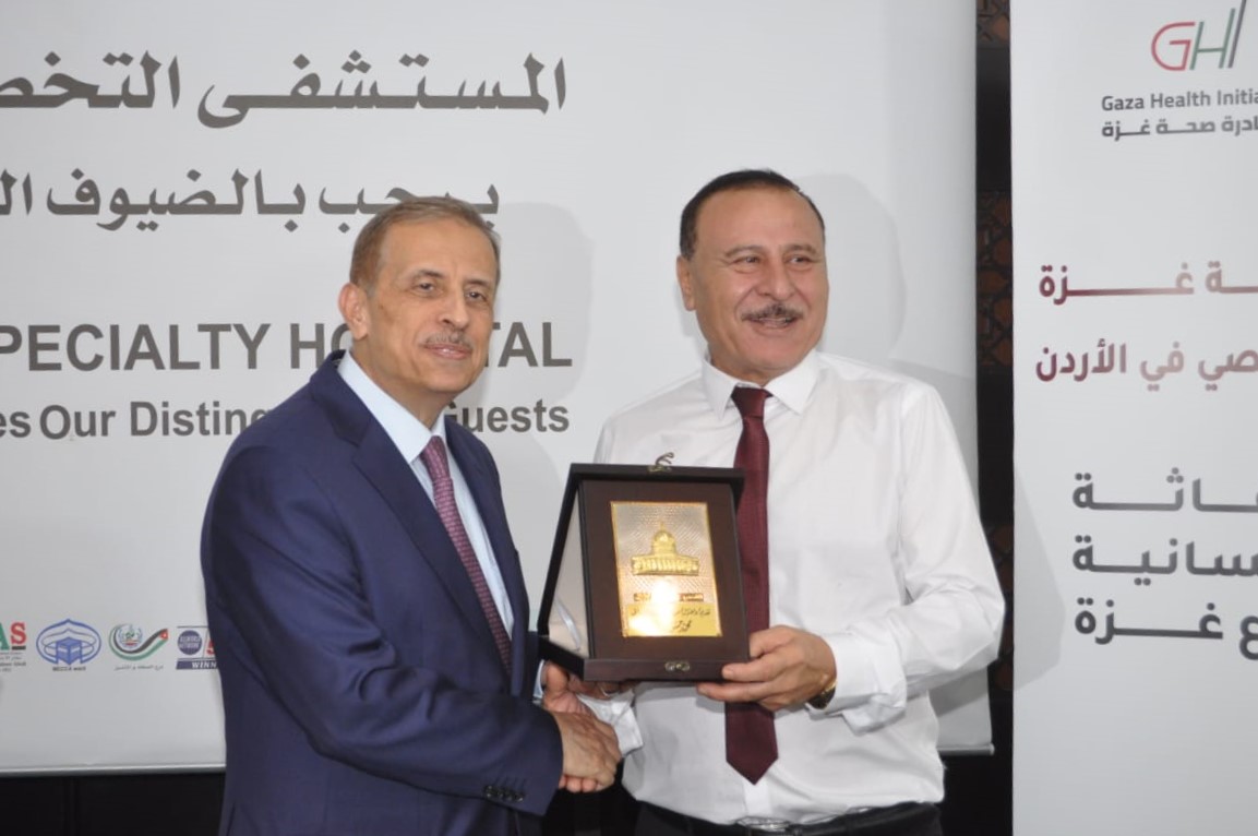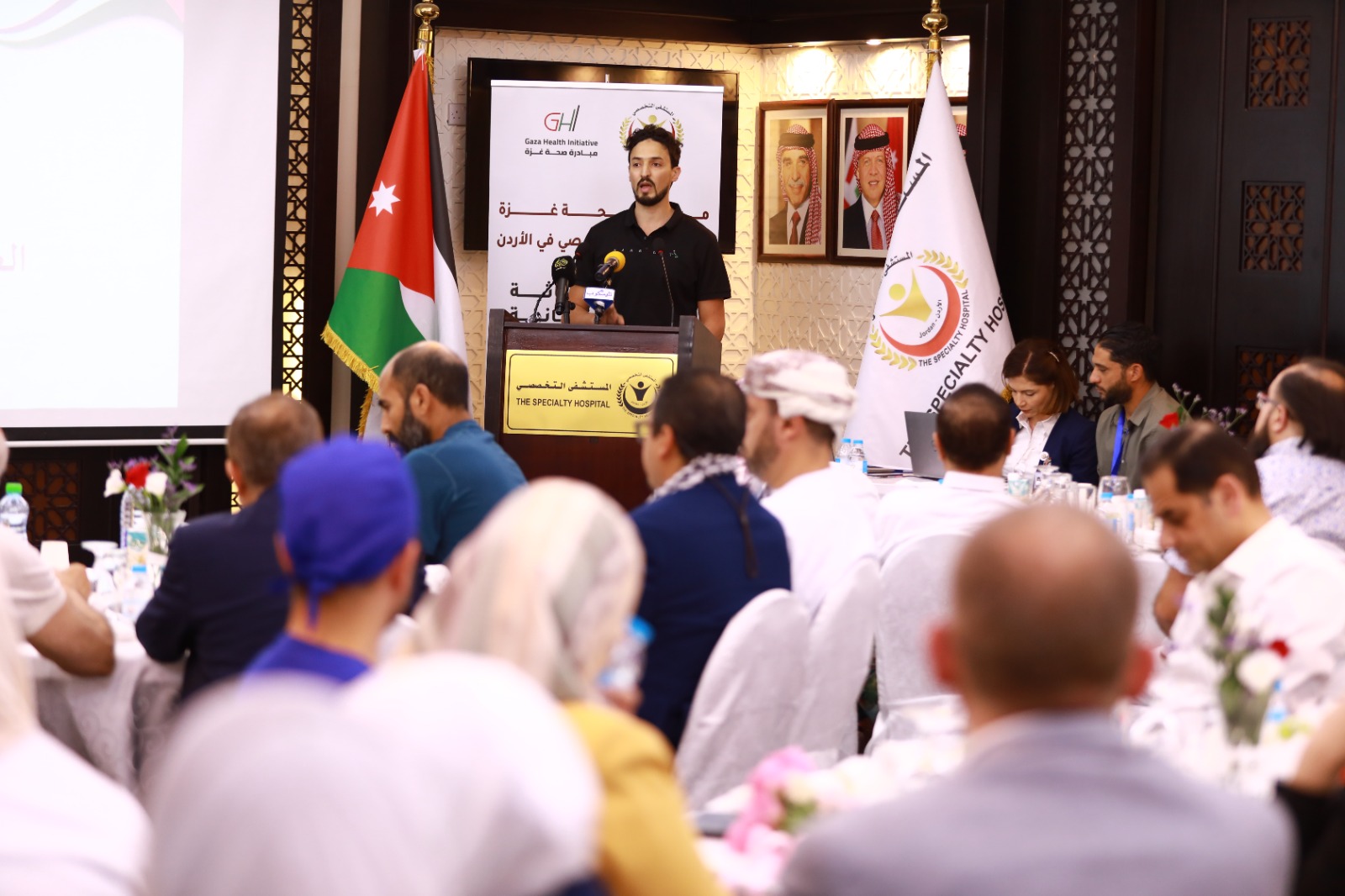 وبيّن الحموري في كلمته إلى ما وصلت إليه مبادرة صحة غزة والتي اصبحت تضم ما يزيد عن 50 منظمة وجمعية ومؤسسة صحية وانسانية من حول العالم ، وأشار الى اختتام المؤتمر الدولي الثاني للمبادرة والذي كان بعنوان “العدالة لغزة” في الجامعة الأميركية في بيروت، حيث يجري تنفيذ عدة خطط هامة ومنها إطلاق تحالف دولي للتعليم الصحي لدعم نظام التعليم في غزة حيث باشر طلبة الطب في غزة بإكمال دراستهم عن بعد من خلال الجامعة الافتراضية التي اطلقت مؤخرا ويشارك فيها عشرات الاساتذة من مختلف دول العالم، بالإضافة إلى إعلانه عن إرسال عشرات أجهزة (اللابتوب والتابلت) لطلاب الطب لإكمال دراستهم، إلى جانب المساهمة في دفع الرسوم الجامعية لطلاب الطب الذين يدرسون خارج القطاع، والسعي لتعزيز الجهود القانونية لاستعادة السلام والإنصاف وحقوق الإنسان للشعب الفلسطيني، مطالباً المجتمع الدولي بضرورة حماية المستشفيات والمراكز الصحية المتبقية في القطاع وتسهيل إدخال المساعدات الطبية والانسانية والمزيد من الفرق الطبية، معلناً عن إطلاق حملة جديدة لتزويد القطاع بالأدوية والمستلزمات الصحية استكمالاً للدور الذي يقوم به المستشفى التخصصي منذ بدء العدوان على القطاع مشيراً إلى أن هذه الحملة ستركز على المكملات الغذائية (الفيتامينات) بعد سماع صرخات استغاثة من سيدات وأطفال القطاع يشتكون من آلام شديدة ناتجة عن نقص أو انعدام غالبية الاصناف الغذائية، كما ثمن دور الشركاء في تقديم مختلف أنواع الدعم لأهل غزة، وخص بالذكر المنظمات التي تسهل وصول الفرق الطبية الى قطاع غزة ومنها مؤسسة رحمة حول العالم ومؤسسة PROJECT HOPE وجمعية PCRF .