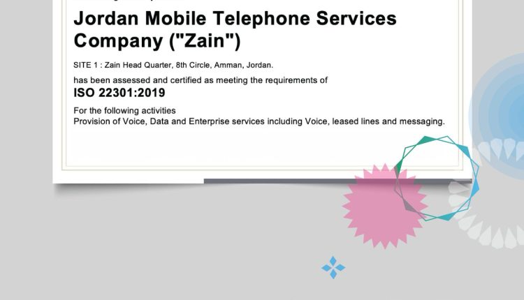 وكالة الناس – حصلت شركة زين الأردن على شهادة الأنظمة الإدارية الآيزوISO” “22301:2019 في إدارة استمرارية الأعمال المُطابقة للمعايير الدولية لأنظمة إدارة استمرارية الأعمال، من قِبل شركة SGS الرائدة عالمياً في مجال اختبارات الفحص والتدقيق والمطابقة.
