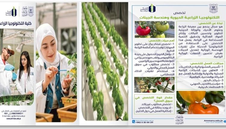 وكالة الناس -يعتبر تخصص التكنولوجيا الزراعية الحيوية وهندسة الجينات برنامج أكاديمي ديناميكي مبتكر يؤدى إلى الحصول على درجة البكالوريوس ويؤهل الطالب للحصول على لقب مهندس زراعي مسجل في نقابة المهندسين الزراعيين. وأمامه مجالات عمل في المؤسسات الزراعية والغذائية العامة والخاصة وفي المراكز البحثية الوطنية والإقليمية والدولية وفي المؤسسات الأكاديمية والجامعات ومؤسسات التدريب المهني والمنظمات الدولية الحكومية وغير الحكومية و الشركات الخاصة و مؤسسات المجتمع المدني.