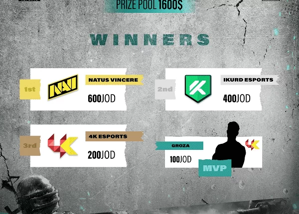 وفاز فريق “NAVI” بالمركز الأول وحصل على جائزة نقدية بقيمة 600 دينار، وحاز فريق “IKURD Esports” على جائزة المركز الثاني البالغة 400 دينار، فيما حل فريق “4K Esports” ثالثاً وحصل على جائزة نقدية بقيمة 200 دينار، وحصل اللاعب “4kGROZA” على جائزة أفضل لاعب والبالغة قيمتها 100 دينار.