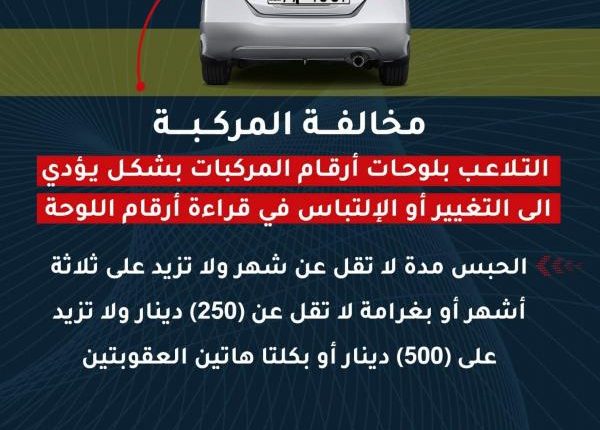 وبحسب قانون السير المعدل فإن مخالفة التلاعب بلوحات ارقام المركبات توجب الحبس مدة لا تقل عن شهر ولا تزيد على 3 أشهر، أو بغرامة لا تقل عن 250 دينار، ولا تزيد على 500 دينار، أو بكلتا هاتين العقوبتين .