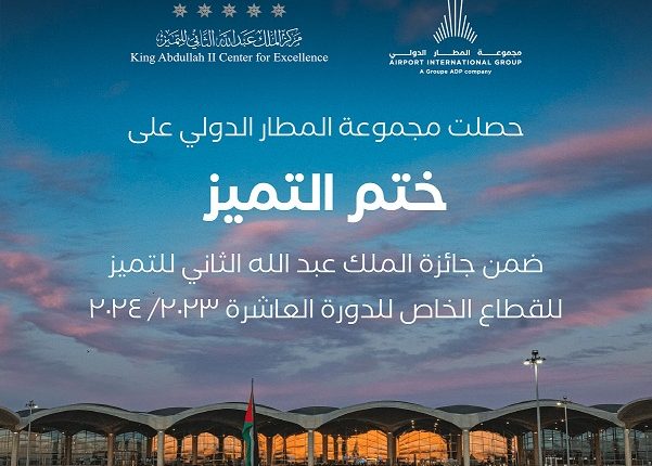 مجموعة مطار الدولي تحصل على “ختم التميّز” ضمن جائزة الملك عبدالله الثاني للتميز