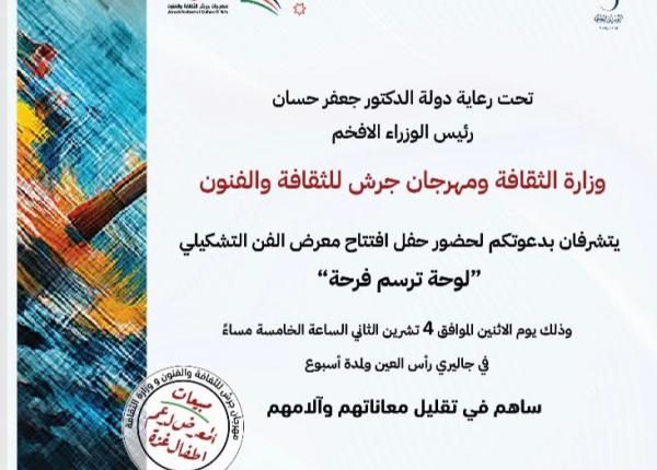 تحت رعاية رئيس الوزراء الدكتور جعفر حسان، وبالتنظيم المشترك لوزارة الثقافة ومهرجان جرش للثقافة والفنون. يفتتح يوم الاثنين 4-11-2024 ولمدة اسبوع معرض “لوحة ترسم فرحة” في جاليري راس العين، حيث يأتي هذا المعرض الفني افي إطار التضامن مع أطفال غزة، يتضمن مجموعة متنوعة من اللوحات الفنية التي أنجزها فنانون أردنيون وعرب من نتاج مشاركتهم بمهرجان جرش للثقافة والفنون في دورته الأخيرة 2024.
