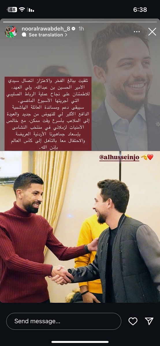 وكالة الناس -هاتف ولي العهد الأمير الحسين بن عبد الله الثاني اللاعب الدولي الأردني نور الدين الروابدة ، للاطمئنان على صحته بعد اجراء عملية الرباط الصليبي.