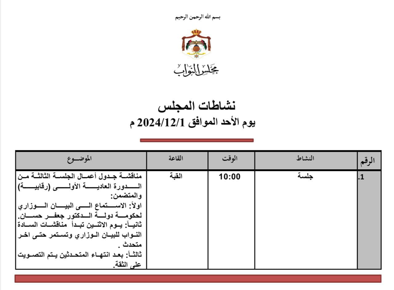 وكالة الناس — قرّر رئيس مجلس النواب أحمد الصفدي دعوة المجلس للانعقاد الأحد، الساعة الـ10صباحا، للاستماع إلى البيان الوزاري لحكومة جعفر حسّان.