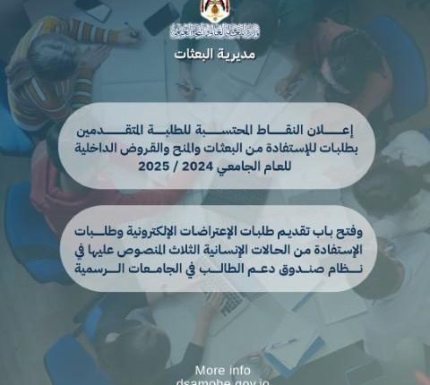 وكالة الناس – أعلنت مديرية البعثات في الوزارة اليوم الخميس الموافق 26-12-2024 البيانات والمعلومات للطلبة المتقدمين بطلبات إلكترونية للاستفادة من المنح والقروض الداخلية للعام الجامعي 2024-2025، إضافةً إلى النقاط المحتسبة لكل منهم، وذلك وفقاً لمعايير الاستفادة من المنح والقروض التي يُعلن عنها وتُنفذ من خلال وزارة التعليم العالي والبحث العلمي للطلبة الدارسين في البرنامج العادي في الجامعات والكليات الأردنية الرسمية، حيث يعتبر هذا الإعلان لأغراض تدقيق الطلبة لنقاطهم وبياناتهم ولا يعتبر ترشيحاً للطالب.