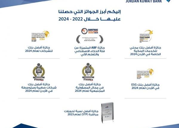 البنك الأردني الكويتي يختتم عام 2024 بحصوله على 7 جوائز عالمية تعزز ريادته في السوق المصرفي