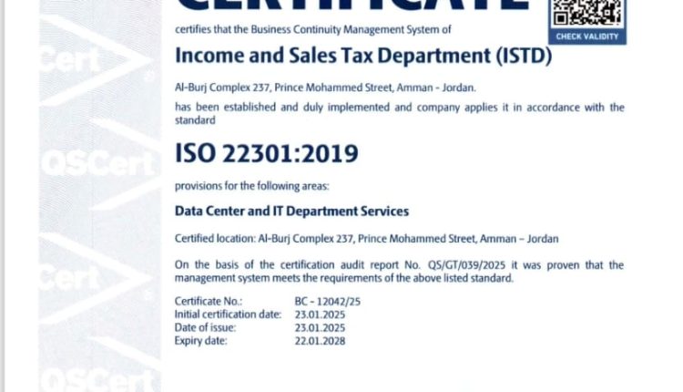 ضريبة الدخل والمبيعات تحصل على شهادة “الآيزو 22301”