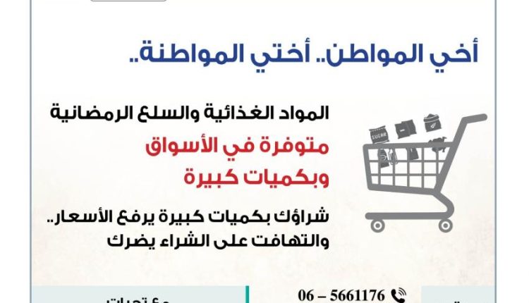 وكالة الناس – دعت وزارة الصناعة والتجارة والتموين المواطنين لعدم التهافت على الشراء استعدادا لشهر رمضان المبارك، حتى لا ترتفع الأسعار دون مبرر.