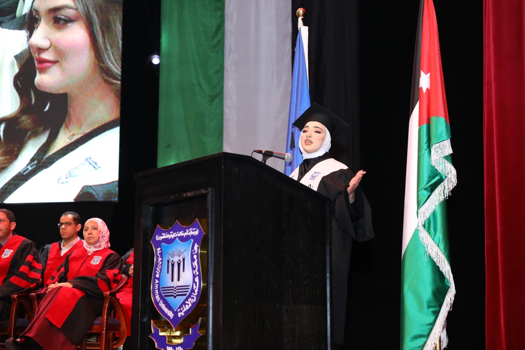 •ثم ألقت الطالبة الخريجة سوار بسام البقور- خريجة كلية الصيدلة بتقدير امتياز- كلمة الخريجين قالت فيها : ومن جامعةِ عمانَ الأهليةِ نهتفُ: يا هناء، كلُّ من فيها أو إليها قلبُهُ يميلُ.والحمد لله الذي بنعمته تتم الصالحات، وبتوفيقه يسَّر لنا أمرنا، وبفضله أقف الآن أمامكم خريجة.