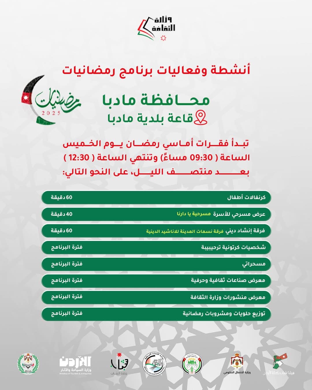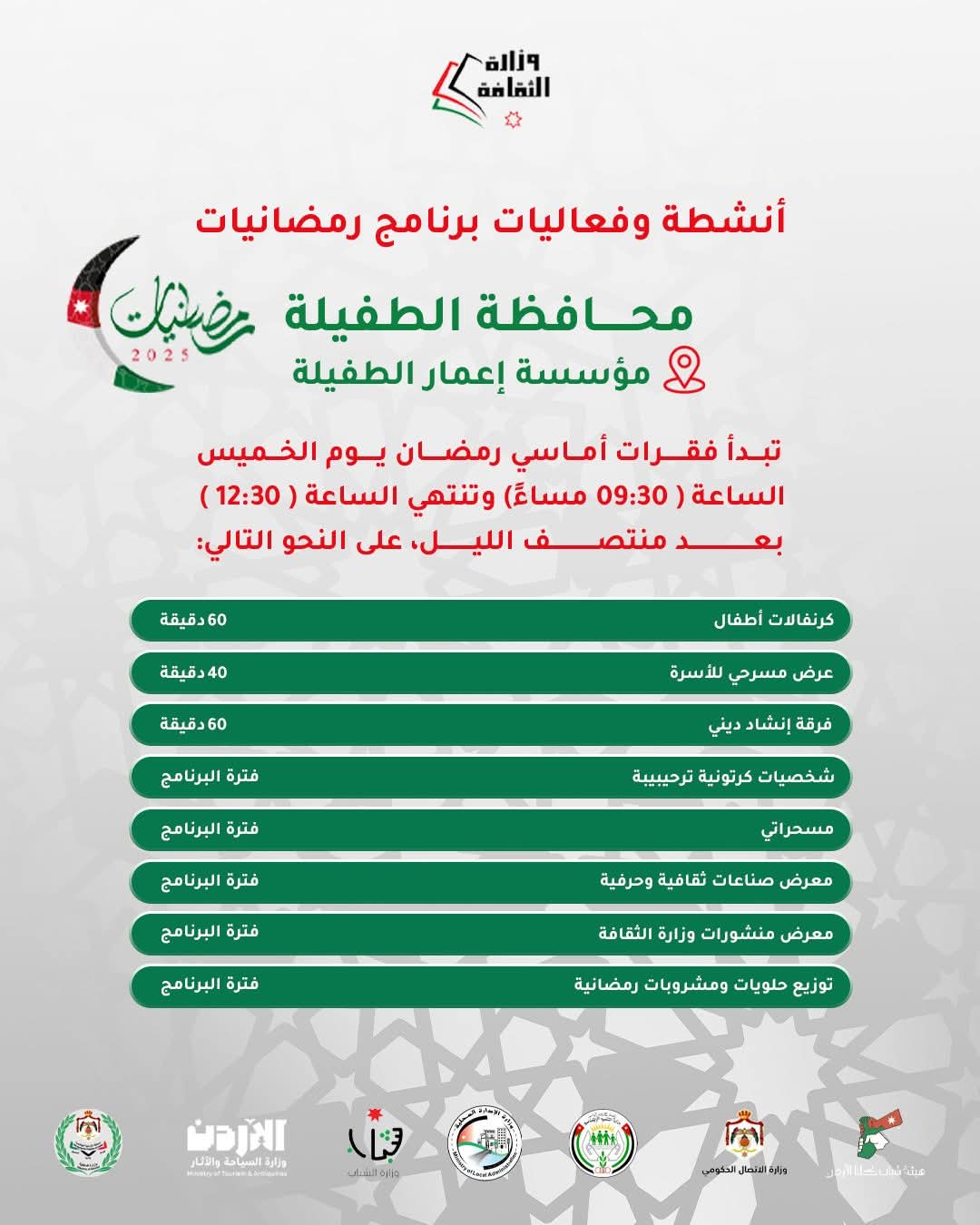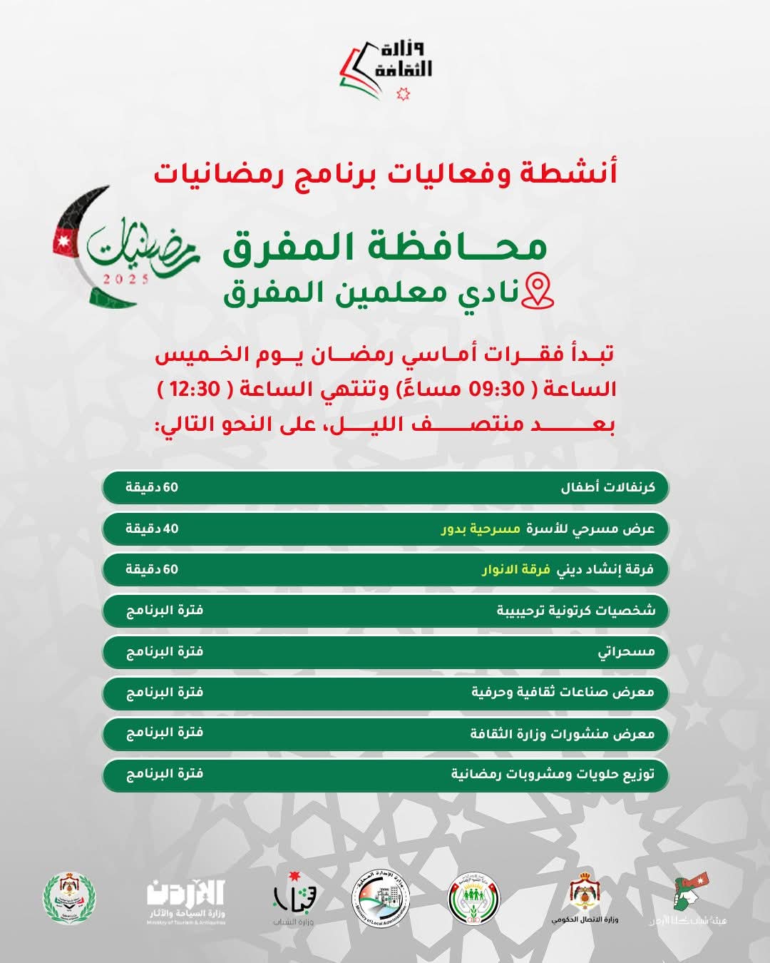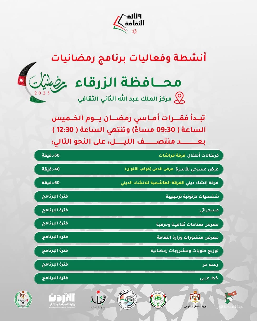 وأدرجت الوزارة دعوتها عبر صفحها الرسمية على الفيسبوك قالت فيها: “الأحبة في العاصمة عمان ندعوكم لحضور فعاليات” رمضانيات ٢٠٢٥ الخميس في المركز الثقافي الملكي وفعاليات فنية وأدبية لكل أفراد العائلة. وتشمل الفعاليات شخصيات كرتونية وكرنفالات للأطفال، وعروضا مسرحية ومسابقات يتخللها توزيع حلويات ومشروبات رمضانية.