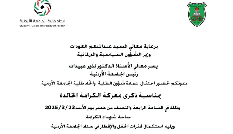 وكالة الناس -تحت رعاية معالي السيد عبد المنعم العودات، وزير الشؤون السياسية والبرلمانية، وبحضور معالي الأستاذ الدكتور نذير عبيدات، رئيس الجامعة الأردنية، نظّمت الجامعة الأردنية احتفالًا بمناسبة ذكرى معركة الكرامة الخالدة.