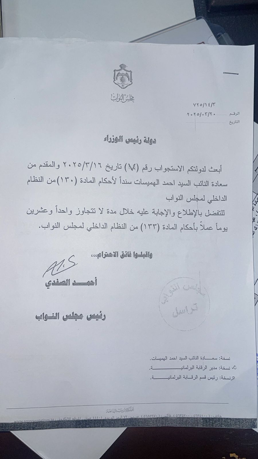 استجواب رئيس الوزراء بسبب سؤال نيابي من الهميسات-وثيقة