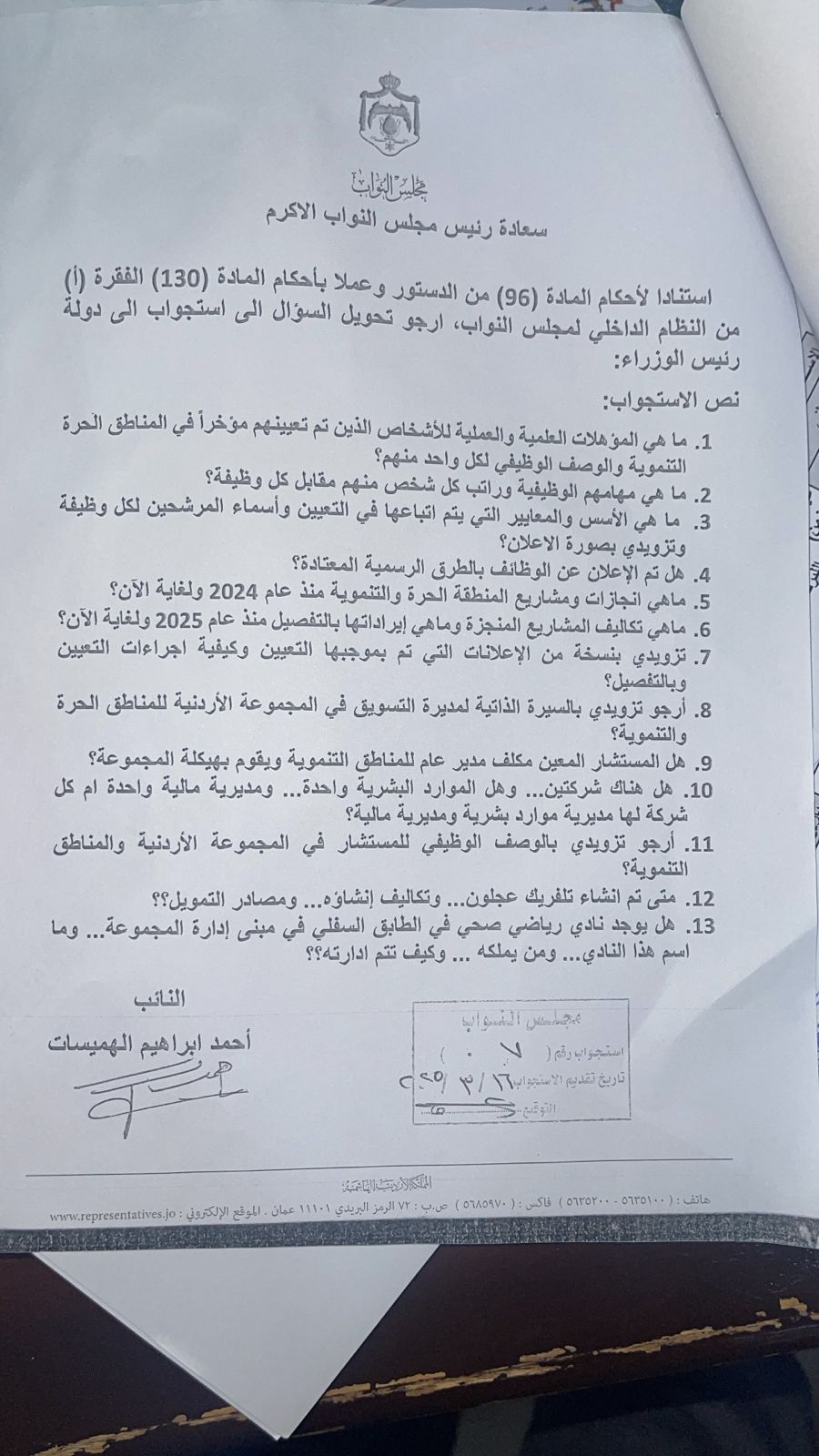 حول النائب الثاني لرئيس مجلس النواب احمد الهميسات سؤاله النيابي لدولة رئيس الوزراء جعفر حسان إلى استجواب للحصول على تفاصيل وتوضيحات أكثر فيما يتعلق بسؤاله حول تعيينات المناطق الحرة التنموية وماهي إنجازات ومشاريع المناطق الحرة.