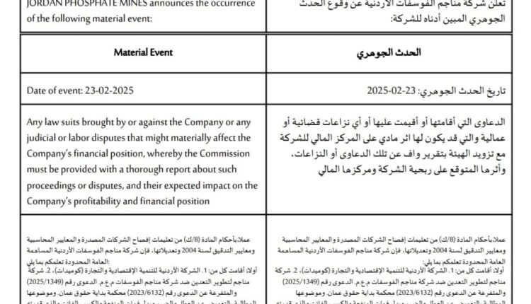 وكالة الناس –  افصحت شركة مناجم الفوسفات الأردنية عبر موقع هيئة الأوراق المالية عن كسبها قرارا قطعيا برد الدعوى المقامة عليها