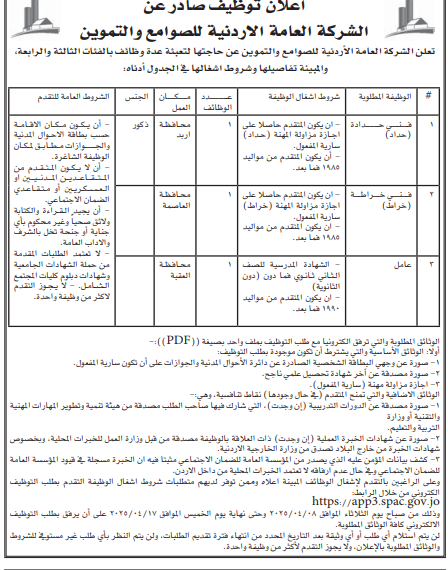 وظائف شاغرة لدى لدى الشركة العامة الاردنية للصوامع والتموين