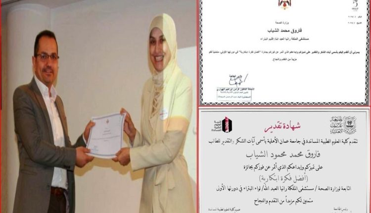 وكالة الناس – فاز الباحث الطالب فاروق الشياب الطالب في برنامج الماجستير في العلوم الطبية المخبرية بكلية العلوم الطبية المساندة بجائزة افضل فكرة ابتكارية على مستوى المملكة و التي تقام للمرة الاولى على هذا المستوى.
