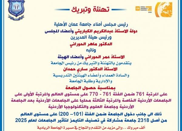 بمناسبة حصول الجامعة على المرتبة 761 ضمن الفئة 761 – 770 على مستوى العالم والمرتبة الأولى على الجامعات الأردنية الخاصة والمرتبة الثالثة محلياً على الجامعات الأردنية بعد الجامعة الأردنية وجامعة العلوم والتكنولوجيا الأردنية.