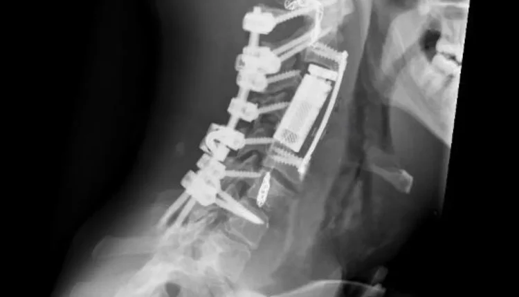 وفي المرحلة الجراحية، تم إجراء تثبيت خلفي للعمود الفقري من الفقرة العنقية الأولى وحتى السابعة، مع تحرير النخاع الشوكي وتأمين استقرار الفقرات، وبعد ذلك، أُجري استئصال كامل للورم والفقرات المصابة بطريقة “الاستئصال الكامل في كتلة واحدة” عبر المدخل الأمامي للعنق، تلاه تعويض الفقرات باستخدام قفص فقري تمددي، مع تثبيت أمامي لضمان الثبات الكامل للعمود الفقري.