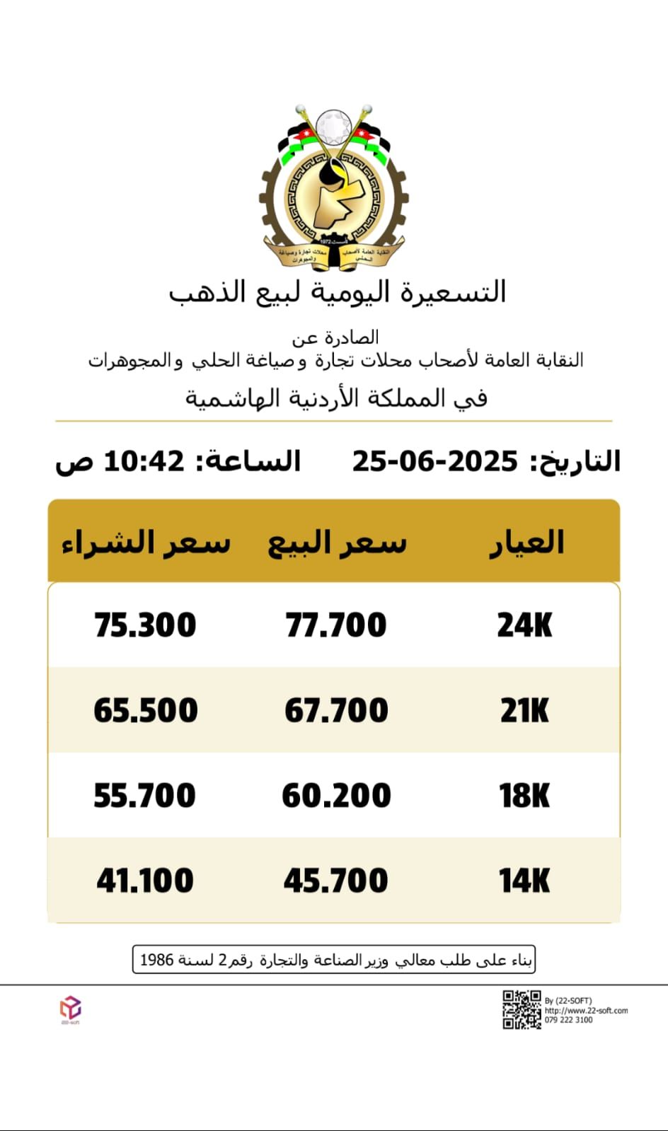 كما بلغ سعر بيع الغرام الواحد لعيارات 24 و18 و14 على التوالي: 77.70 دينارًا، 60.20 دينارًا، و45.70 دينارًا.