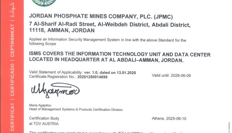 وكالة الناس -حصلت دائرة تكنولوجيا المعلومات في شركة مناجم الفوسفات الأردنية على شهادة ISO/IEC 27001:2022 المعتمدة عالميا في نظام إدارة أمن المعلومات (ISMS)، والتي تمنحها شركة (TÜV Austria).