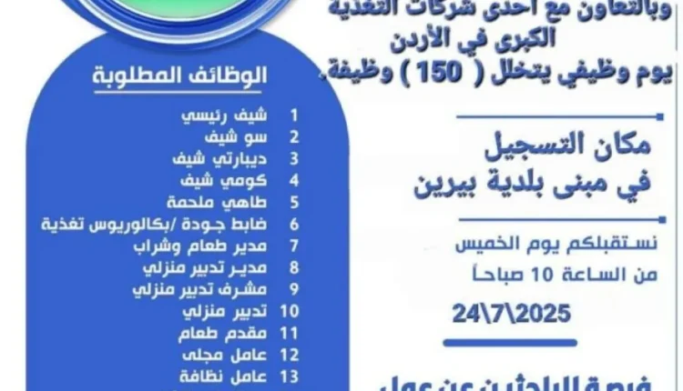 وكالة الناس -تستضيف بلدية بيرين الجديدة من خلال مديرية التنمية المحلية بعد غد الخميس، يوما وظيفيا تقيمه إحدى شركات التغذية في القطاع الخاص لتوفير حوالي 150 فرصة عمل للذكور فقط في وظائف ومهن متنوعة.