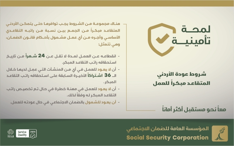 وكالة الناس – نشرت مؤسسة الضمان الاجتماعي، اليوم الأحد لمحات تأمينية حول شروط عودة المتقاعد الأردني مبكراً للعمل.