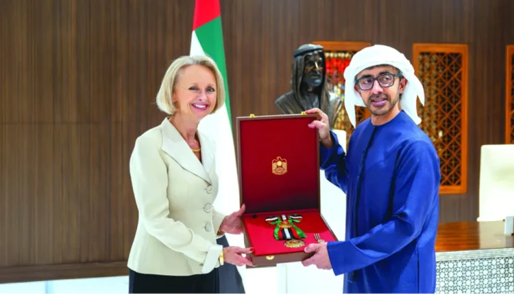 وقلّد الشيخ عبدالله بن زايد آل نهيان، نائب رئيس مجلس الوزراء وزير الخارجية، السفيرة الوسام، خلال استقباله لها، أمس، في أبوظبي.