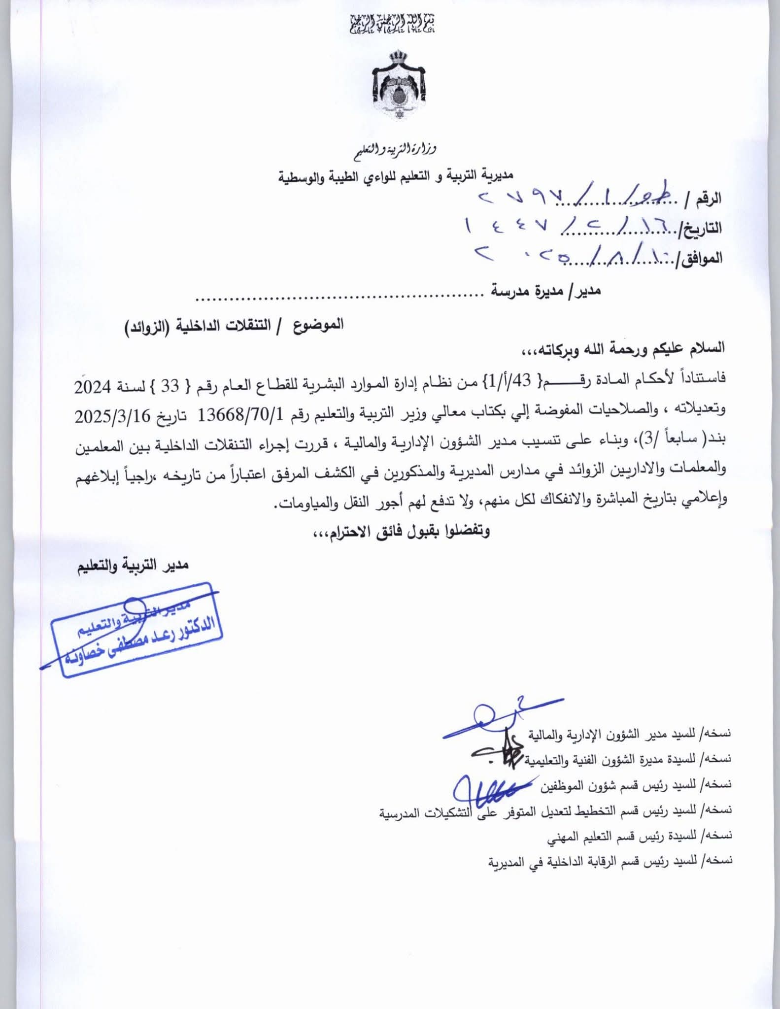 وكالة الناس – قرر مدير التربية والتعليم للواءي الطيبة والوسطية الدكتور رعد مصطفى الخصاونة اليوم، إجراء التشكيلات الإدارية والتنقلات الداخلية وتحديد مراكز العمل للعائدين من اجازة دون راتب وعلاوات، والنقل الخارجي والتعيينات الجديدة للمراكز التعليمية والادارية، وذلك حسب الكشوفات المرفقة.