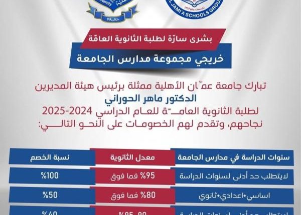 وكالة الناس – تبارك جامعة عمان الأهلية ممثلة برئيس هيئة المديرين الدكتور ماهر الحوراني لطلبة مجموعة مدارس الجامعة الناجحين في الثانوية العامة للعام الدراسي 2024-2025 ، وتقدم لهم الخصومات المبينة في الصورة المرفقة .
