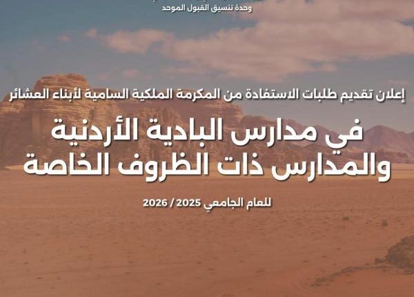 وكالة الناس -أعلنت اللجنة العليا للمكرمة الملكية السـامية لأبناء العشائر في مـدارس البـادية الأردنية والمدارس ذات الظـروف الخاصة في وزارة التعليم العالي والبحث العلمي، عن بدء تقديم طلبات الاستفادة من المكرمة الملكية السامية للعام الجامعي 2025-2026، وذلك اعتباراً من صباح اليوم الأحد وحتى الساعة الثانيـة عشرة ليلاً من يوم الأحد الموافق 24-8-2025.
