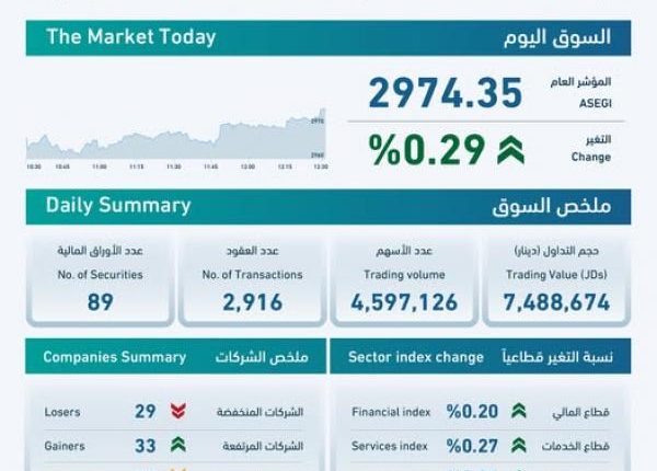 وعن مستويات الأسعار، فقد ارتفع الرقم القياسي العام لأسعار الأسهم لإغلاق هذا اليوم إلى 2974 نقطة، بارتفاع نسبته 0.29 بالمئة.
