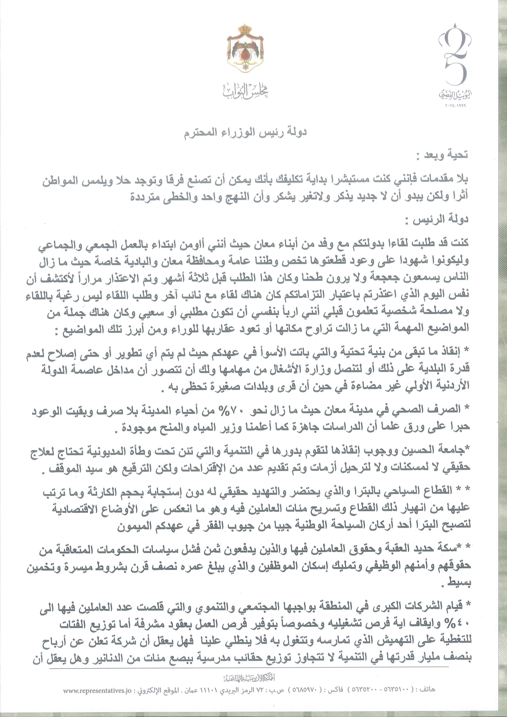 كنت قد طلبت لقاءا بدولتكم مع وفد من أبناء معان حيث أنني أؤمن ابتداء بالعمل الجمعي والجماعي وليكونوا شهودا على وعود قطعتموها تخص وطننا عامة ومحافظة معان والبادية خاصة حيث ما زال الناس يسمعون جعجعة ولا يرون طحنا وكان هذا الطلب قبل ثلاثة أشهر وتم الاعتذار مراراً لأكتشف أن نفس اليوم الذي اعتذرتم باعتبار التزاماتكم كان هناك لقاء مع نائب آخر وطلب اللقاء ليس رغبة باللقاء ولا مصلحة شخصية تعلمون قبلي أنني اربأ بنفسي أن تكون مطلبي أو سعيي وكان هناك جملة من المواضيع المهمة التي ما زالت تراوح مكانها أو تعود عقاربها للوراء ومن أبرز تلك المواضيع: