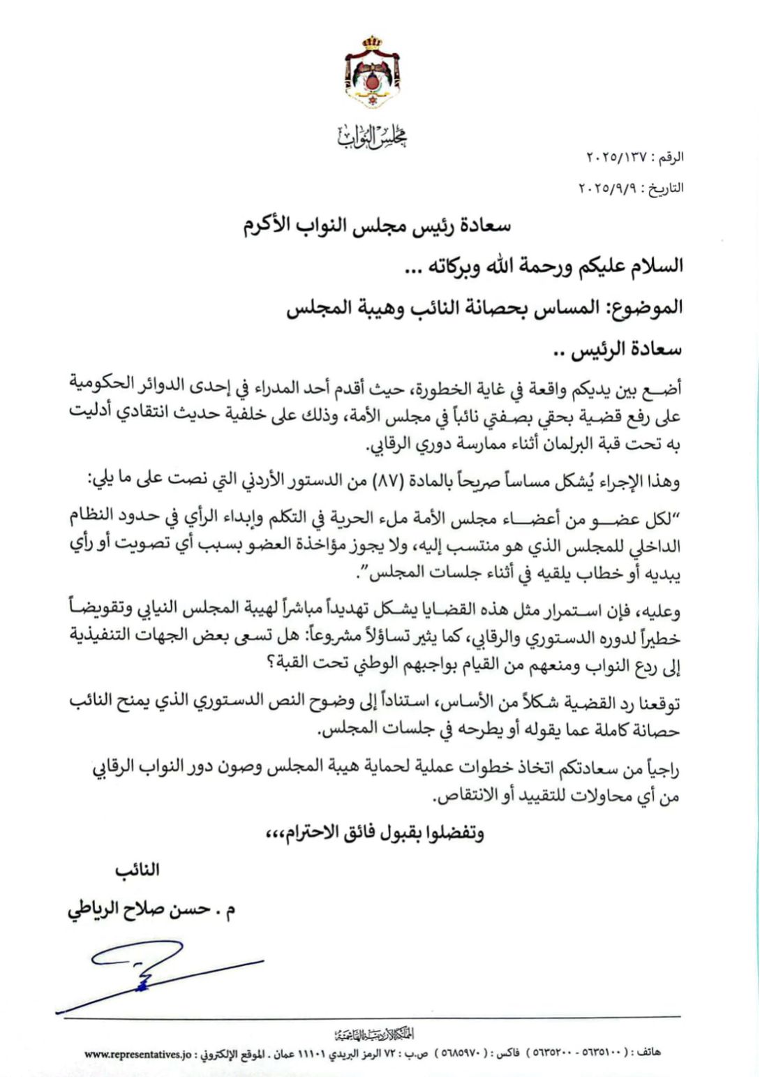 وقال الرياطي في رسالته إن “هذا الإجراء يُشكل مساساً صريحاً بالمادة (87) من الدستور الأردني”، والتي تنص على أن “لكل عضو من أعضاء مجلس الأمة ملء الحرية في التكلم وإبداء الرأي في حدود النظام الداخلي للمجلس الذي هو منتسب إليه، ولا يجوز مؤاخذة العضو بسبب أي تصويت أو رأي يبديه أو خطاب يلقيه في أثناء جلسات المجلس”.