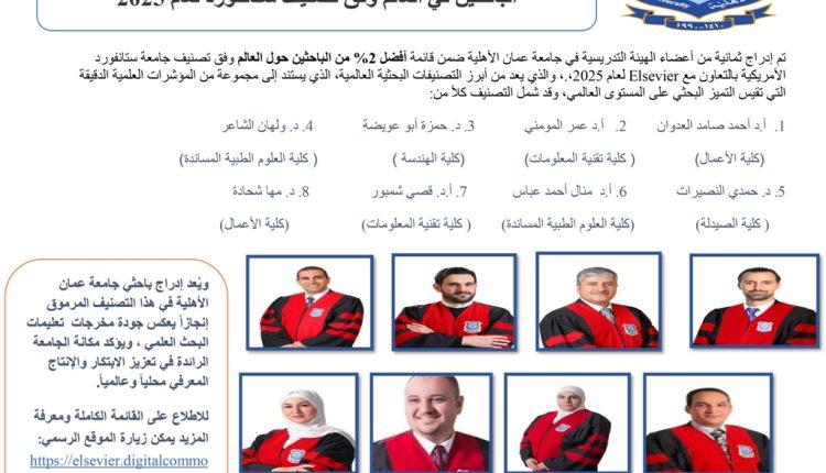 وكالة الناس – تم إدراج ثمانية من أعضاء الهيئة التدريسية في جامعة عمان الأهلية ضمن قائمة أفضل 2% من الباحثين حول العالم وفق تصنيف جامعة ستانفورد الأمريكية بالتعاون مع Elsevier لعام 2025،.، والذي يعد من أبرز التصنيفات البحثية العالمية، وقد شمل التصنيف كلاً من: