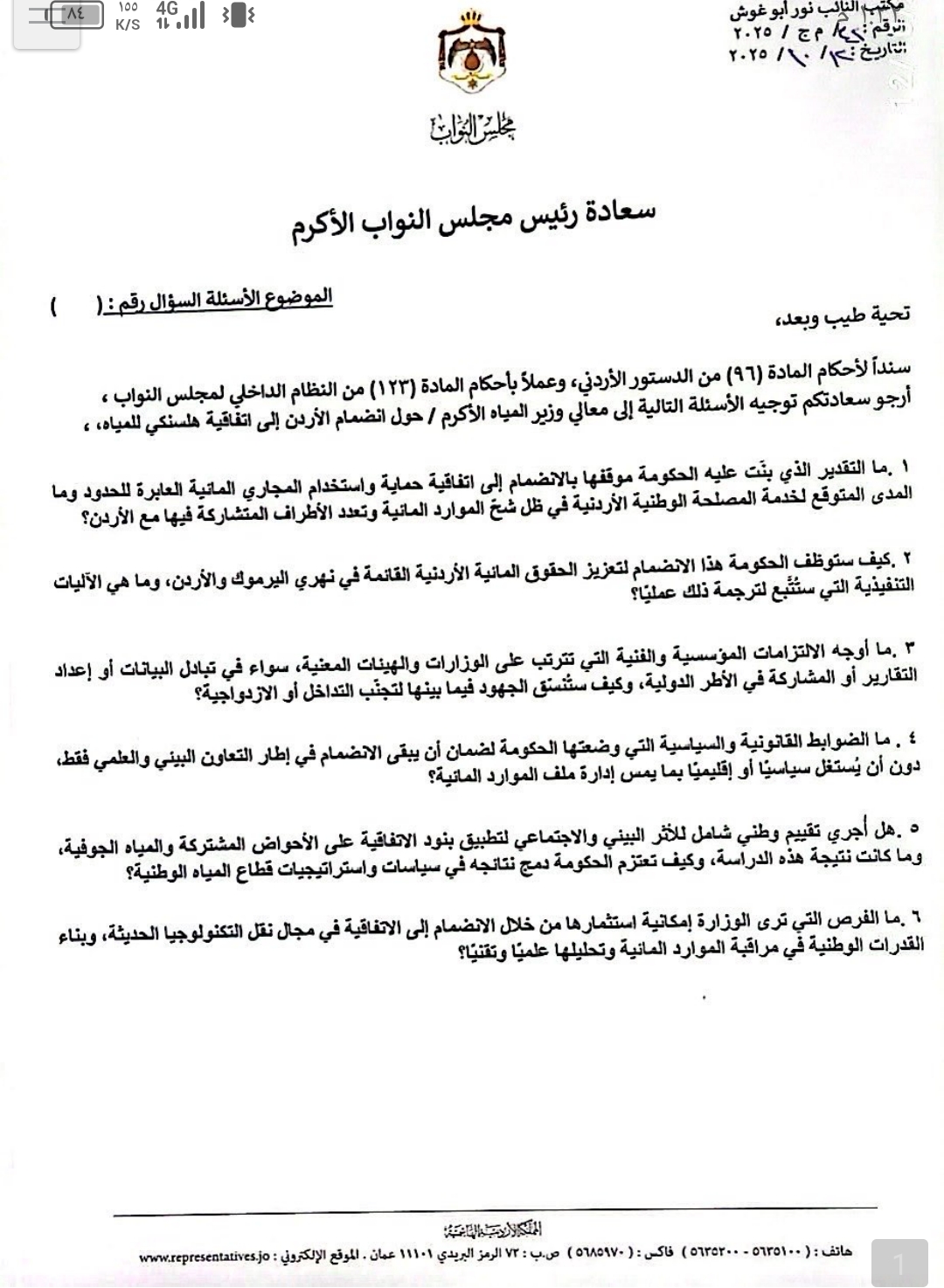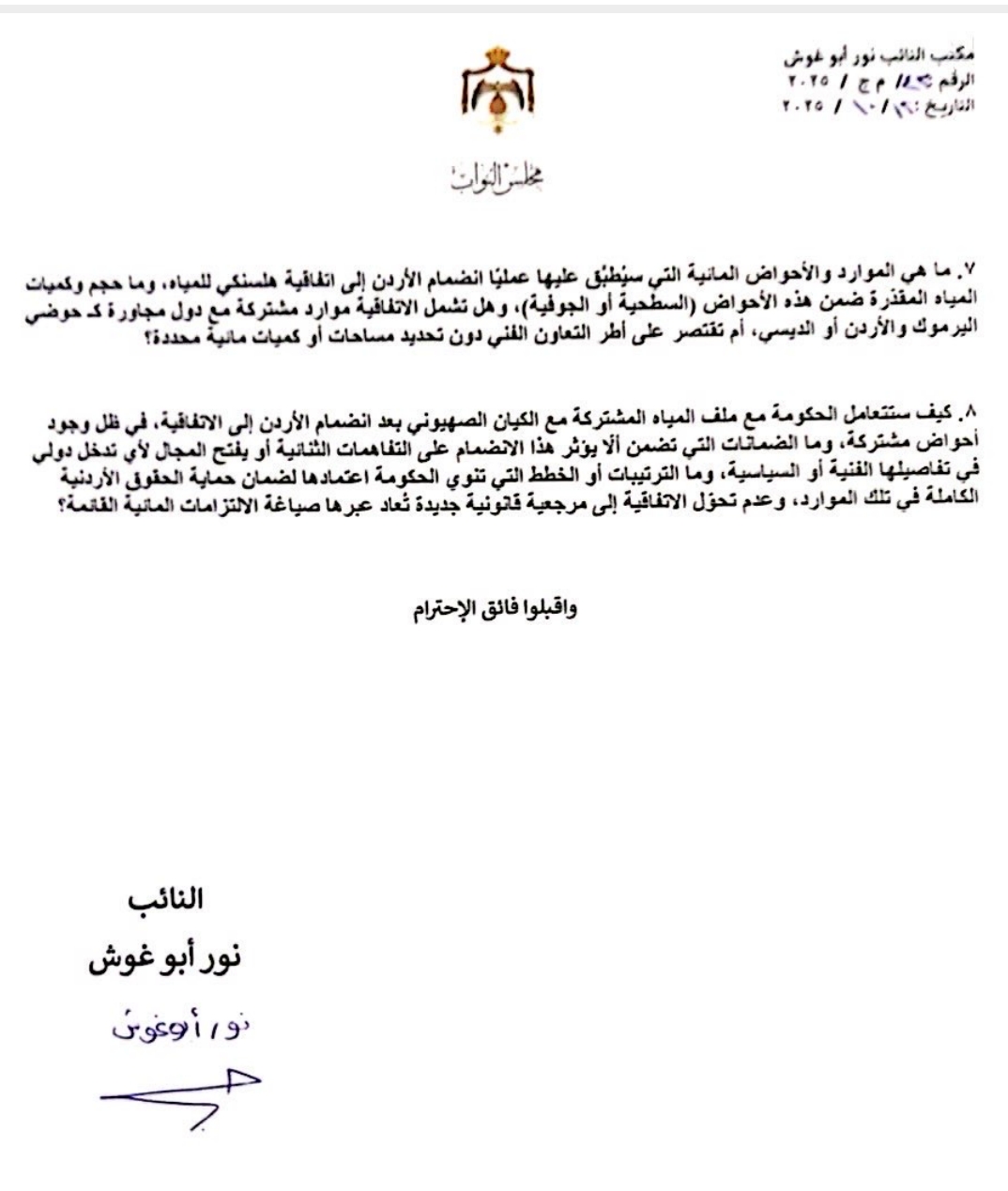 وفي ختام سؤالها، شدّدت النائب نور أبو غوش على ضرورة بيان كيفية تعامل الحكومة مع ملف المياه المشتركة مع الكيان الصهيوني بعد الانضمام إلى الاتفاقية، مؤكدة أهمية ضمان حماية الحقوق المائية الأردنية كاملةً ومنع أي تدخل دولي أو إعادة تفسير للالتزامات القائمة بما قد يؤثر على السيادة المائية الوطنية.