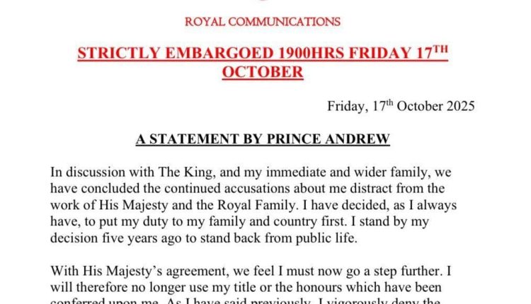 وكالة الناس-رسميا.. وفي سابقة بتاريخ العائلة المالكة.. شقيق جلالة الملك الأمير أندرو يتخلى عن جميع ألقابه وأوسمته بما في ذلك لقب دوق يورك بعد مناقشة مع الملك تشارلز وعائلته وبـ ‘موافقة الملك’ وسط تكهنات بأن شقيقه الملك أجبره على القرار عقب الكشف عن لقاء جمعه بمسؤول صيني كبير في قلب قضية تجسس مثيرة للجدل.