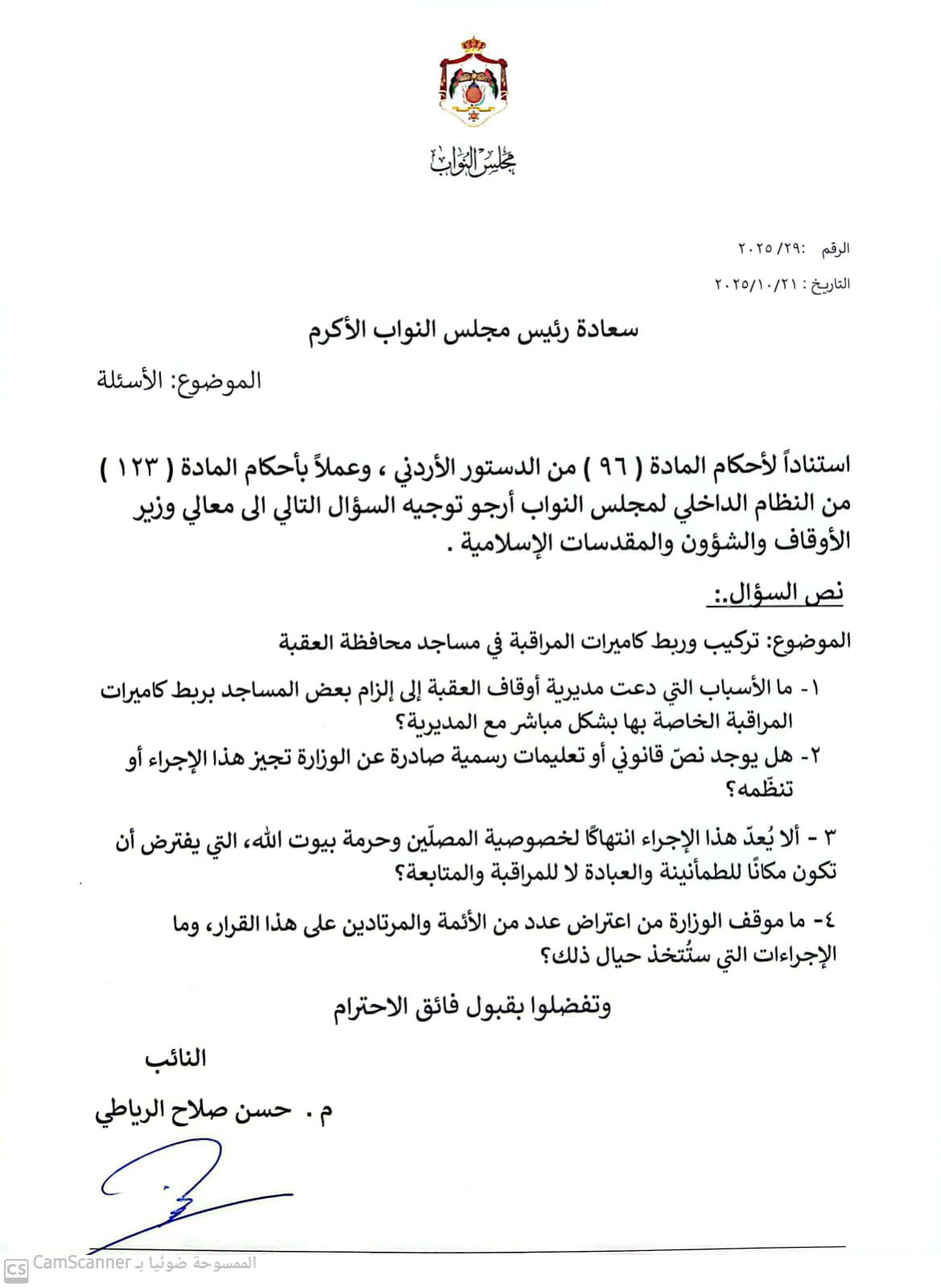 وجّه النائب المهندس حسن صلاح الرياطي سؤالاً نيابياً إلى معالي وزير الأوقاف والشؤون والمقدسات الإسلامية حول قيام مديرية أوقاف العقبة بإلزام بعض المساجد بتركيب كاميرات مراقبة خاصة بها بشكل مباشر مع المديرية.