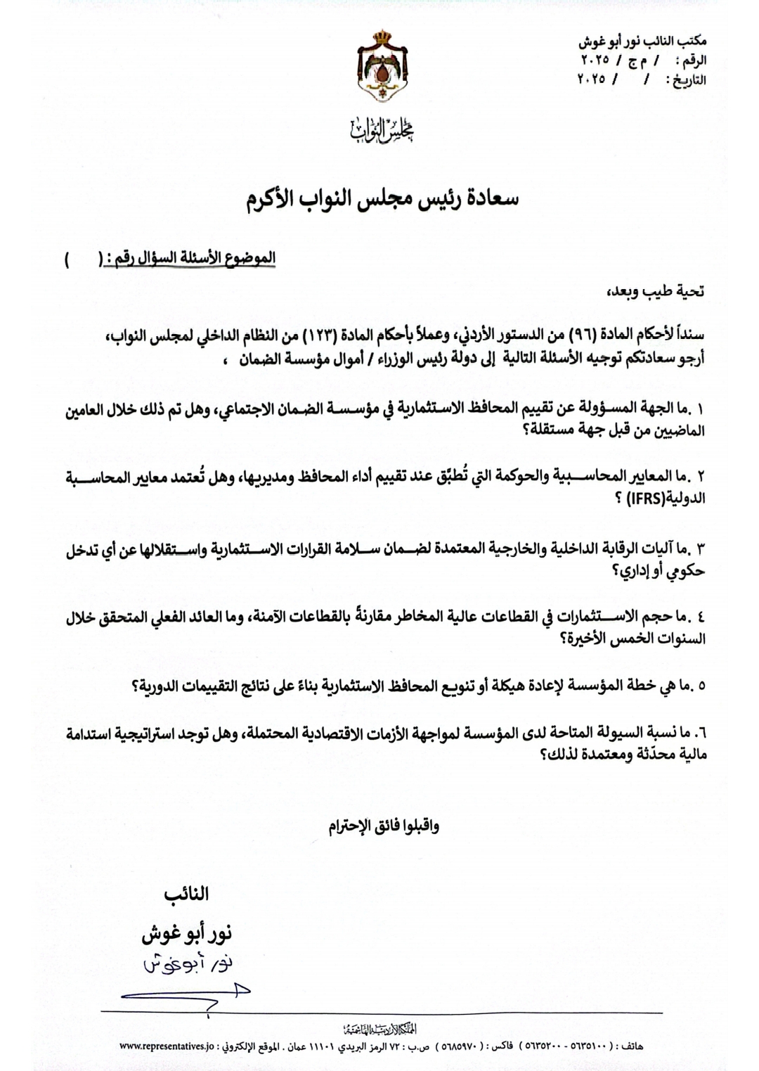وجهت النائب نور أبو غوش سؤالًا نيابيًا إلى دولة رئيس الوزراء يتعلق بـ أموال واستثمارات مؤسسة الضمان الاجتماعي، مستندة إلى أحكام المادة (96) من الدستور الأردني والمادة (123) من النظام الداخلي لمجلس النواب.
