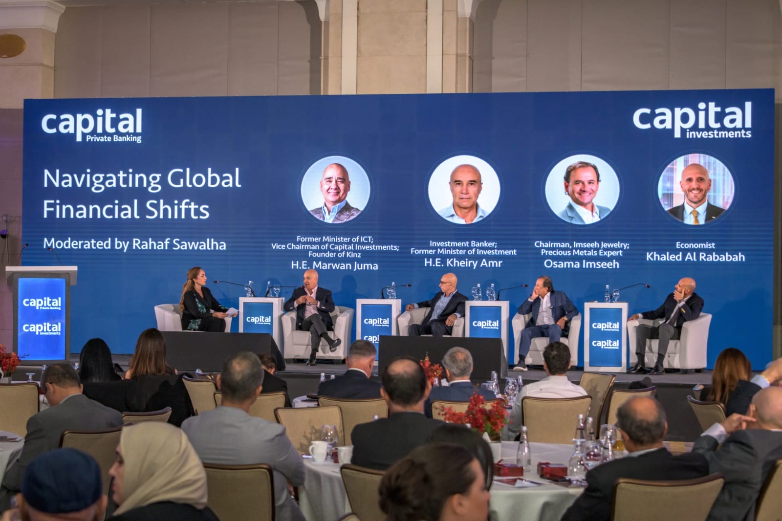 وأعقب العرض جلسة حوارية بعنوان “استشراف التحولات المالية العالمية: من الذهب إلى النمو”، شارك فيها وزير الاستثمار الأسبق معالي السيد خيري عمرو، ووزير الاتصالات الأسبق معالي السيد مروان جمعة، ورئيس مجلس إدارة شركة إمسيح للمجوهرات السيد أسامة امسيح، والخبير والمحلل الاقتصادي السيد خالد الربابعة، حيث ناقش المتحدثون التوجهات الاستثمارية العالمية، ودور الذهب كملاذ آمن، والسياسات النقدية والتحولات المصرفية، والاستثمار في التكنولوجيا والذكاء الاصطناعي محلياً وعالمياً، كما قدّموا نصائحهم ومقترحاتهم حول كيفية التعامل مع مشهد اقتصادي متغير ومتسارع.