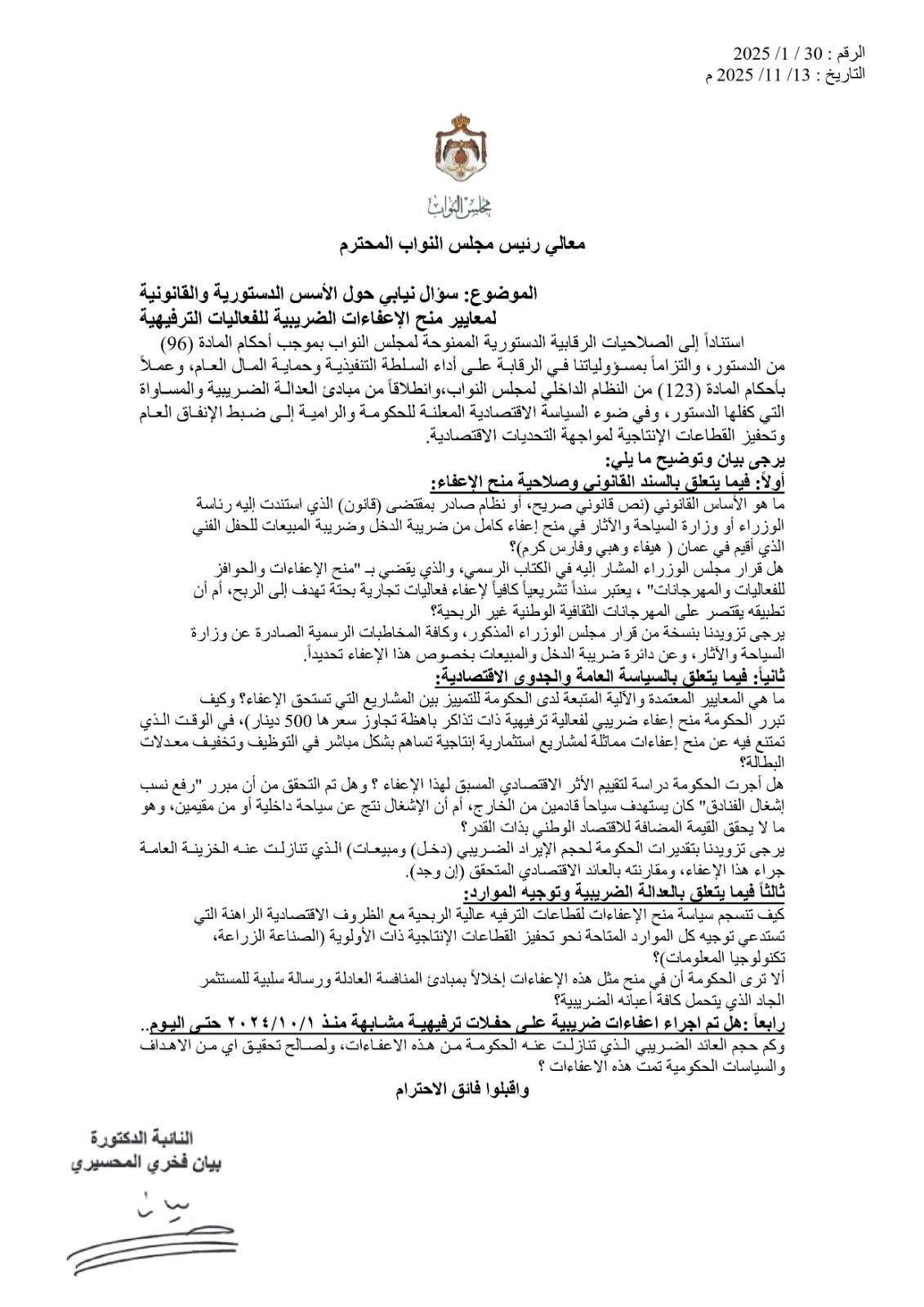 كما طلبت النائب بيان المحسيري من الحكومة توضيح المعايير والآليات التي تعتمدها في منح الإعفاءات، متسائلةً عن الجدوى الاقتصادية من إعفاء فعالية ترفيهية باهظة الثمن تجاوزت أسعار تذاكرها 500 دينار، في وقت تُحرم فيه المشاريع الإنتاجية من إعفاءات مشابهة رغم مساهمتها في تشغيل الأردنيين وتحفيز النمو الاقتصادي.