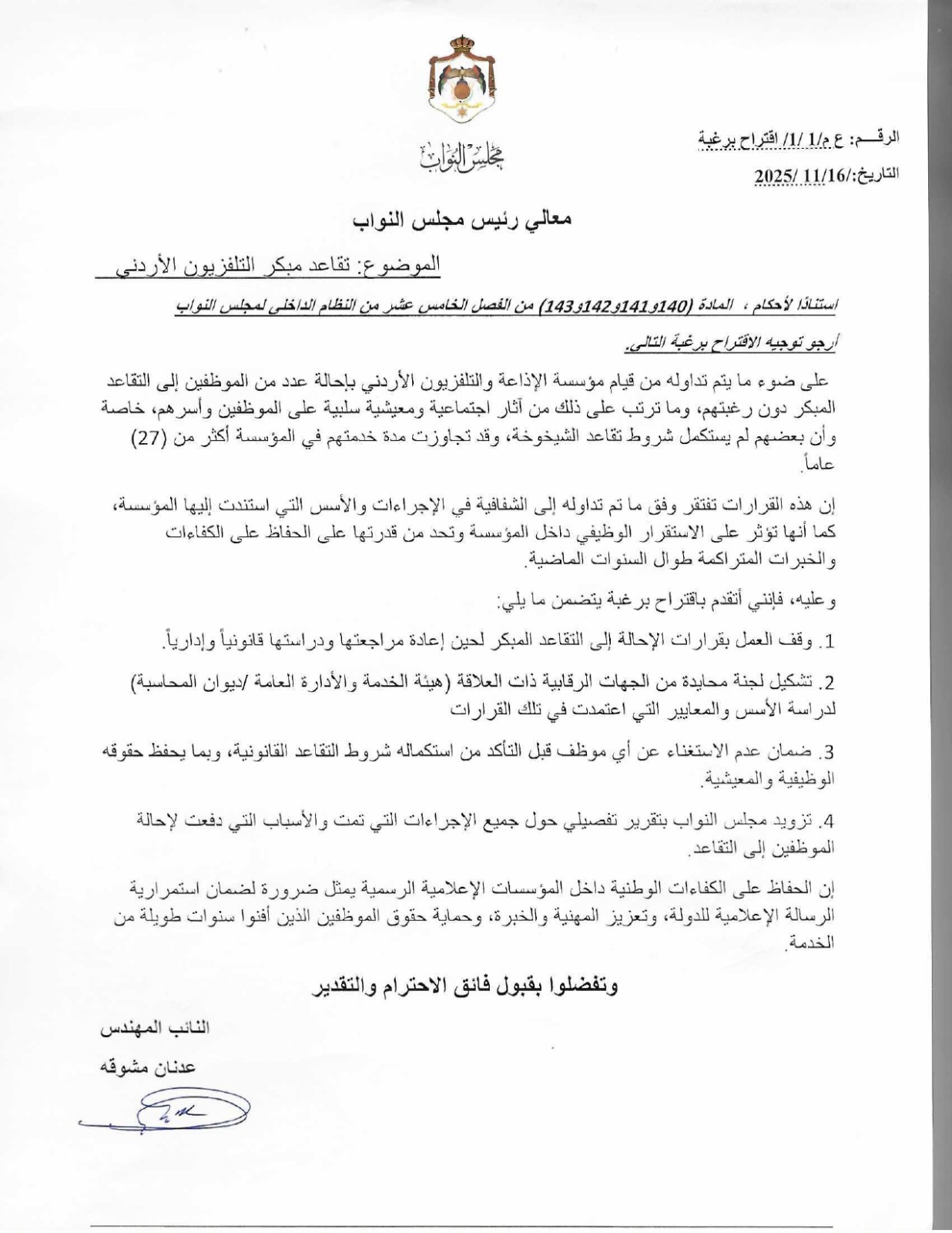 النائب مشوقة يتقدم باقتراح برغبة للحكومة يطالب فيها بأنصاف موظفي التقاعد المبكر ووقف الأجراءات لحين التحقق.