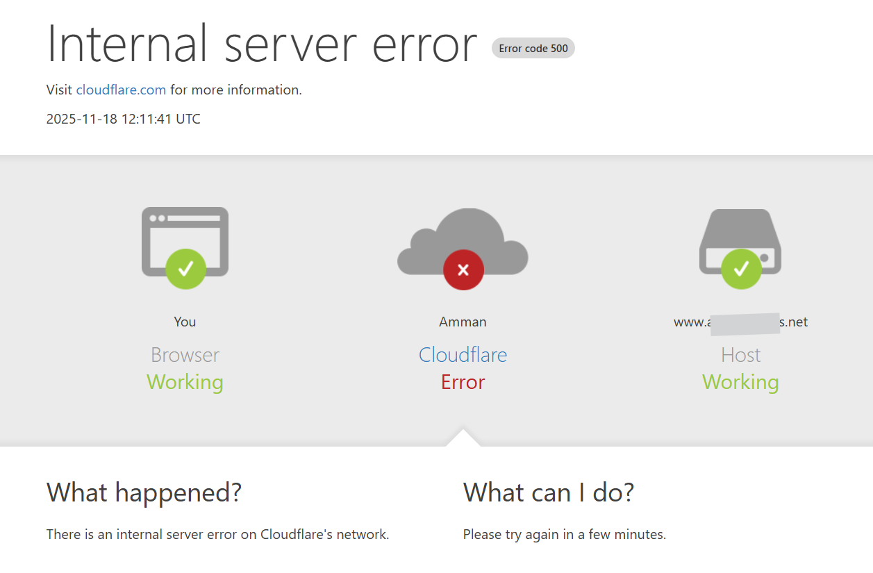 وكالة الناس -تعرضت مجموعة من المواقع الإلكترونية الأردنية، عصر اليوم الثلاثاء، إلى أعطال مفاجئة نتيجة خلل تقني في سيرفرات شركة كلاودفلير العالمية داخل الأردن، ما أدى إلى تعذّر وصول المستخدمين إلى بعض المنصات لفترات متفاوتة.