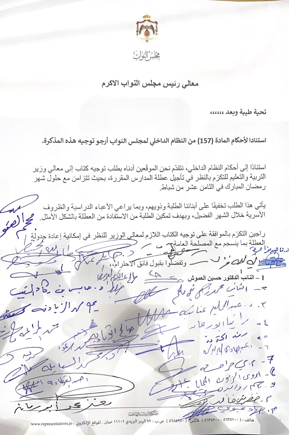 وطالب العموش في مذكرته رئيس مجلس النواب بمخاطبة معالي وزير التربية والتعليم لدراسة إمكانية إعادة جدولة العطلة المدرسية، مؤكدا أن هذا الإجراء يحقق مصلحة عامة ويعزز الاستقرار الدراسي.