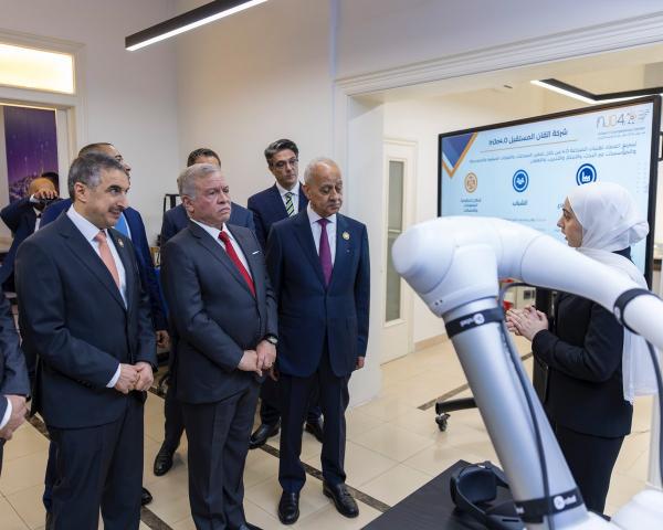 وزار جلالة الملك مركز الابتكار الأردني للثورة الصناعية الرابعة (InJo4.0) في مقر غرفة الصناعة، واستمع إلى شرح من المهندسة دانا قدع عن المركز الذي يهدف إلى تسريع تبني الحلول الرقمية والتكنولوجية في القطاع الصناعي لرفع الإنتاجية وتعزيز التنافسية.