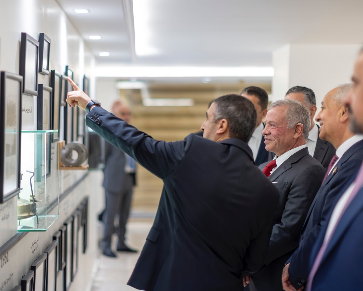 ولدى وصول جلالة الملك إلى غرفة صناعة عمان، اطلع على جدارية تستعرض مسيرة الصناعة الأردنية، واستمع إلى شرح قدمه مدير الغرفة الدكتور نائل الحسامي عن أبرز محطات تطور القطاع.