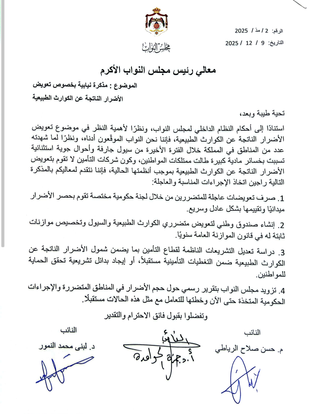 قدّم النائبان م. حسن صلاح الرياطي ود. لبنى محمد النمور مذكرة نيابية إلى رئيس مجلس النواب، طالبا فيها الحكومة باتخاذ إجراءات عاجلة لتعويض المواطنين المتضررين من الكوارث الطبيعية التي شهدتها عدة مناطق في المملكة خلال الفترة الماضية، والتي تسببت بخسائر مادية كبيرة نتيجة السيول والأحوال الجوية الاستثنائية.