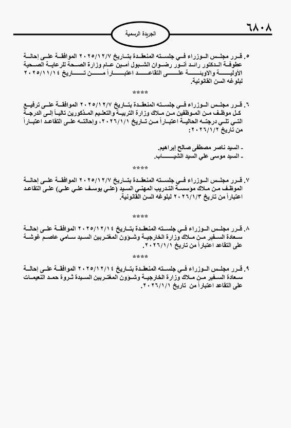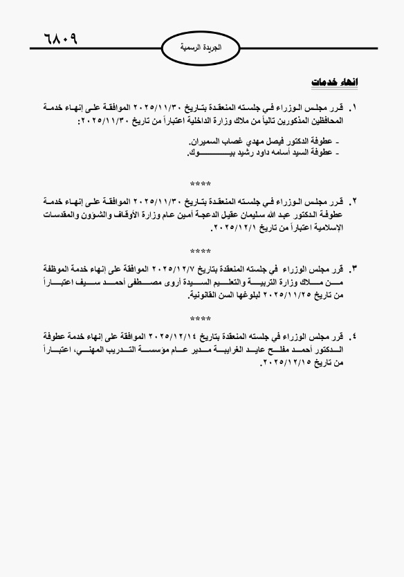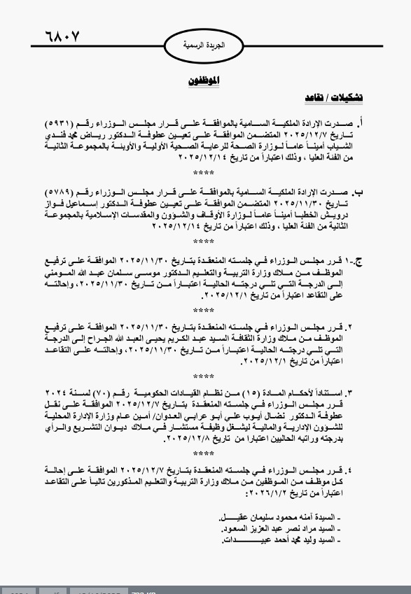 تعيينات وإحالات على التقاعد لموظفين حكوميين (أسماء) On ديسمبر 16, 2025 Share وكالة الناس – صدرت الإرادة الملكية السامية، في عدد الجريدة الرسمية اليوم الثلاثاء، الموافقة على قرار مجلس الوزراء المتضمن بتعيين وترفيع وإحالة موظفين حكوميين إلى التقاعد . وتاليا الأسماء والتفاصيل: