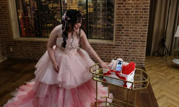 وشملت مراسم الزواج مشاهدتها للشخصية عبر نظارات ذكية للواقع المعزز، فيما ارتدت فستانًا ورديًا فاتحًا، بحسب عدة تقارير.