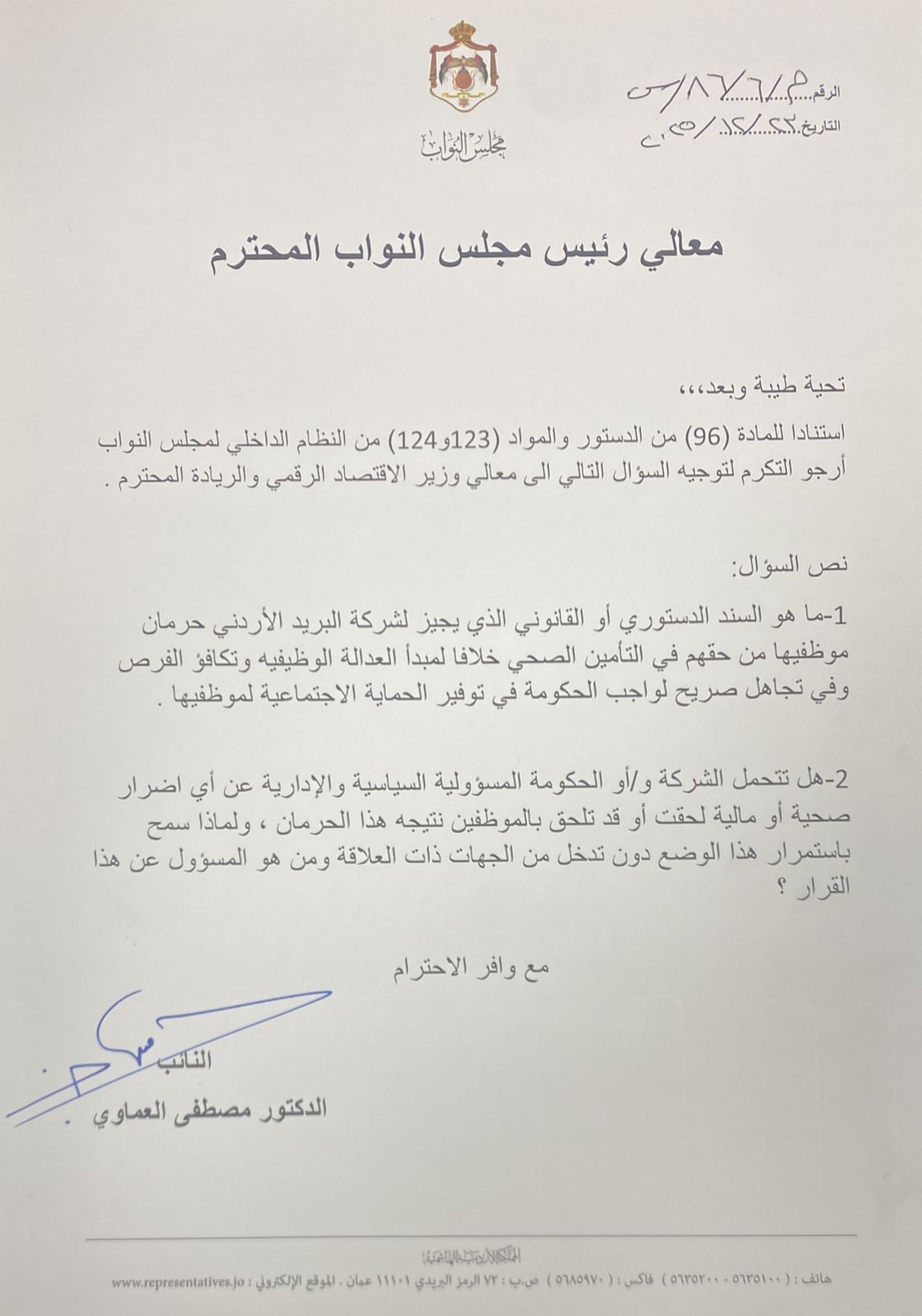 وجّه النائب الدكتور مصطفى العماوي سؤالاً نيابياً إلى وزير الاقتصاد الرقمي والريادة، استناداً لأحكام المادة (96) من الدستور والمادتين (123 و124) من النظام الداخلي لمجلس النواب، حول حرمان موظفي شركة البريد الأردني من حقهم في التأمين الصحي.